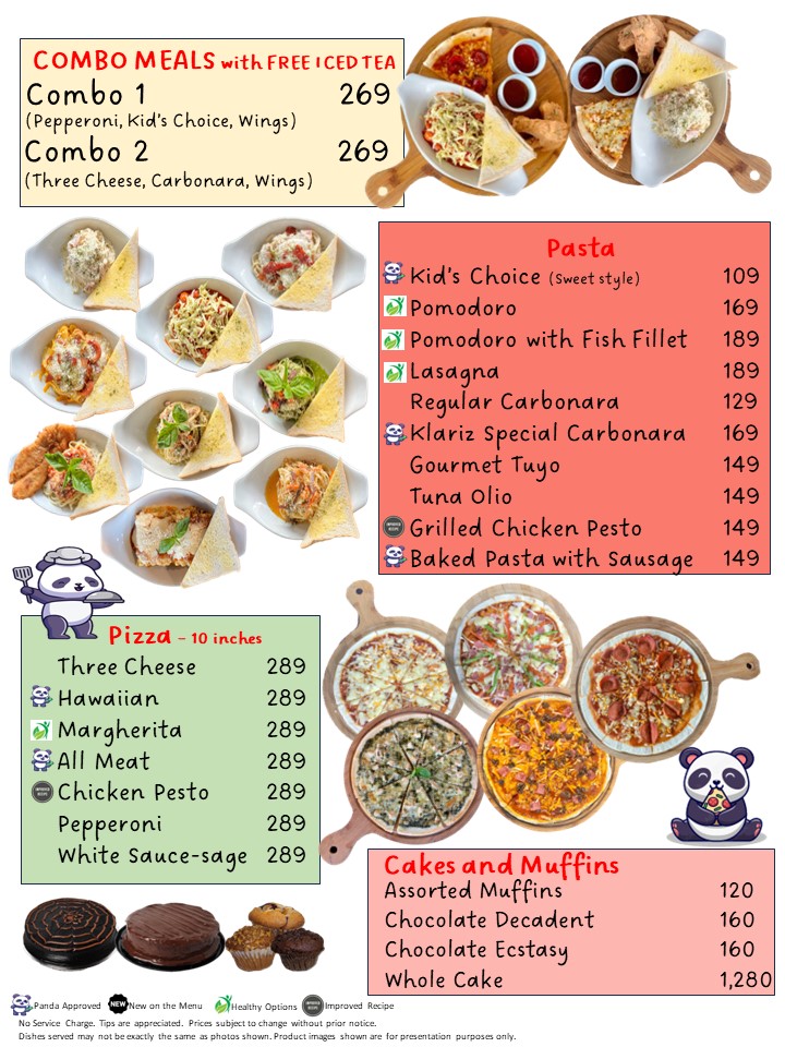 - Main Courses: Contains pizza, pasta dishes like carbonara, and rice-based meals such as corned beef fried rice.