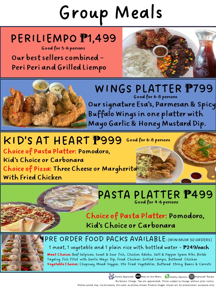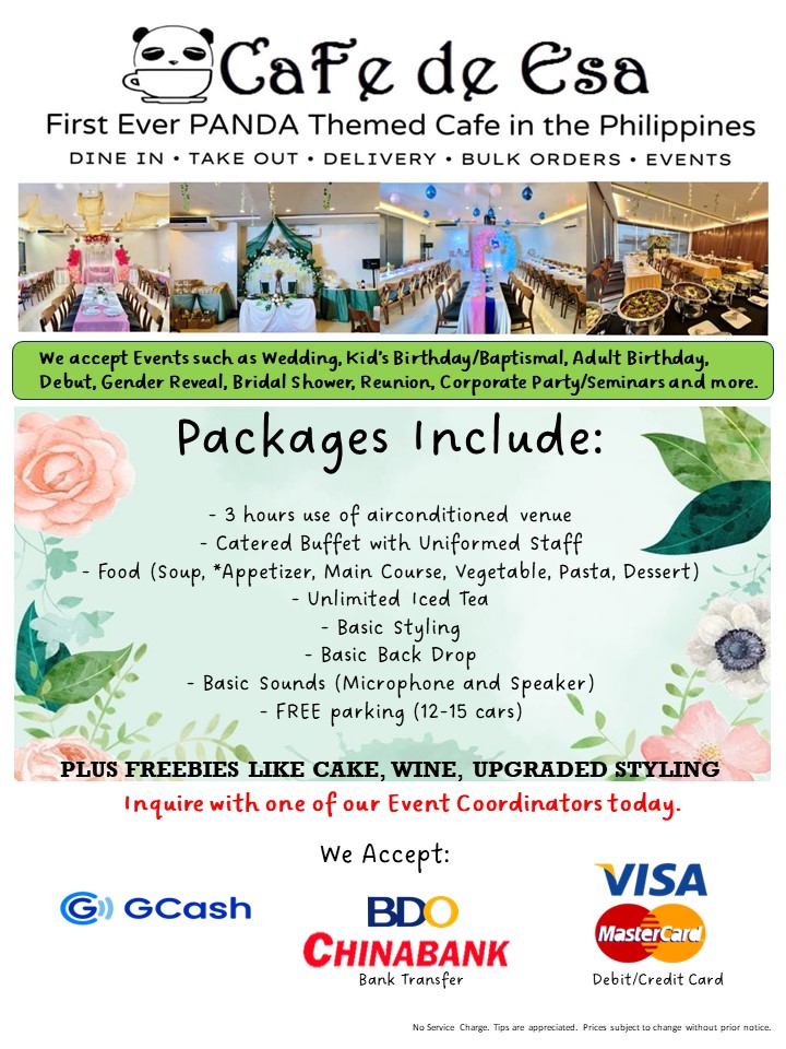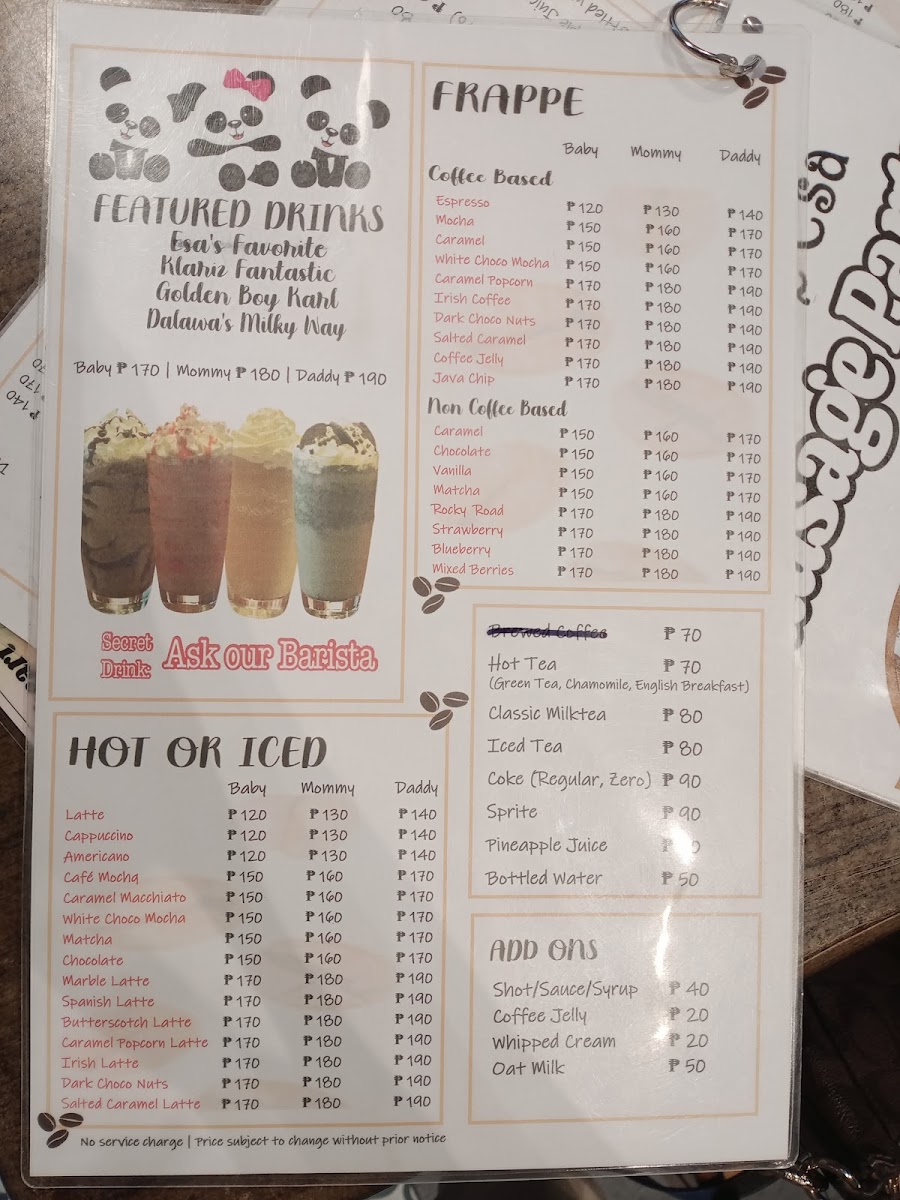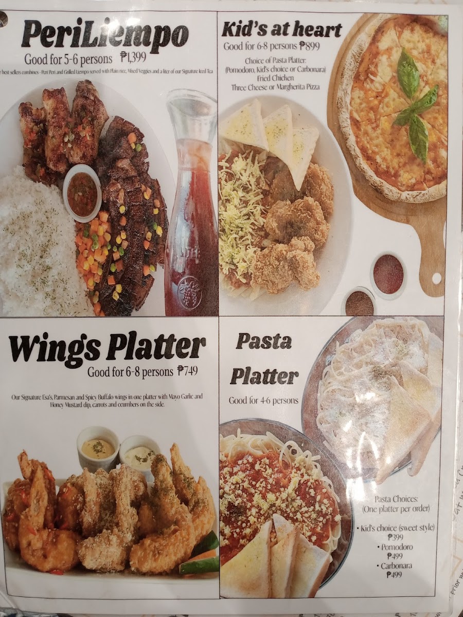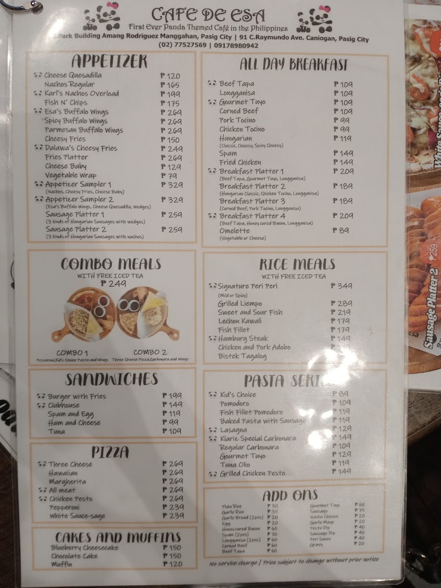 The menu at Cafe De Esa offers a variety of items suitable for different times of the day, including breakfast options, light meals, and drinks. It features a selection of coffee beverages such as lattes, iced coffee variants, frappes, and specialty teas like matcha and green tea. For those looking for more substantial meals, the menu includes dishes such as meat-based pizzas, various platters including sausage and breakfast platters, pasta, and rice meals.